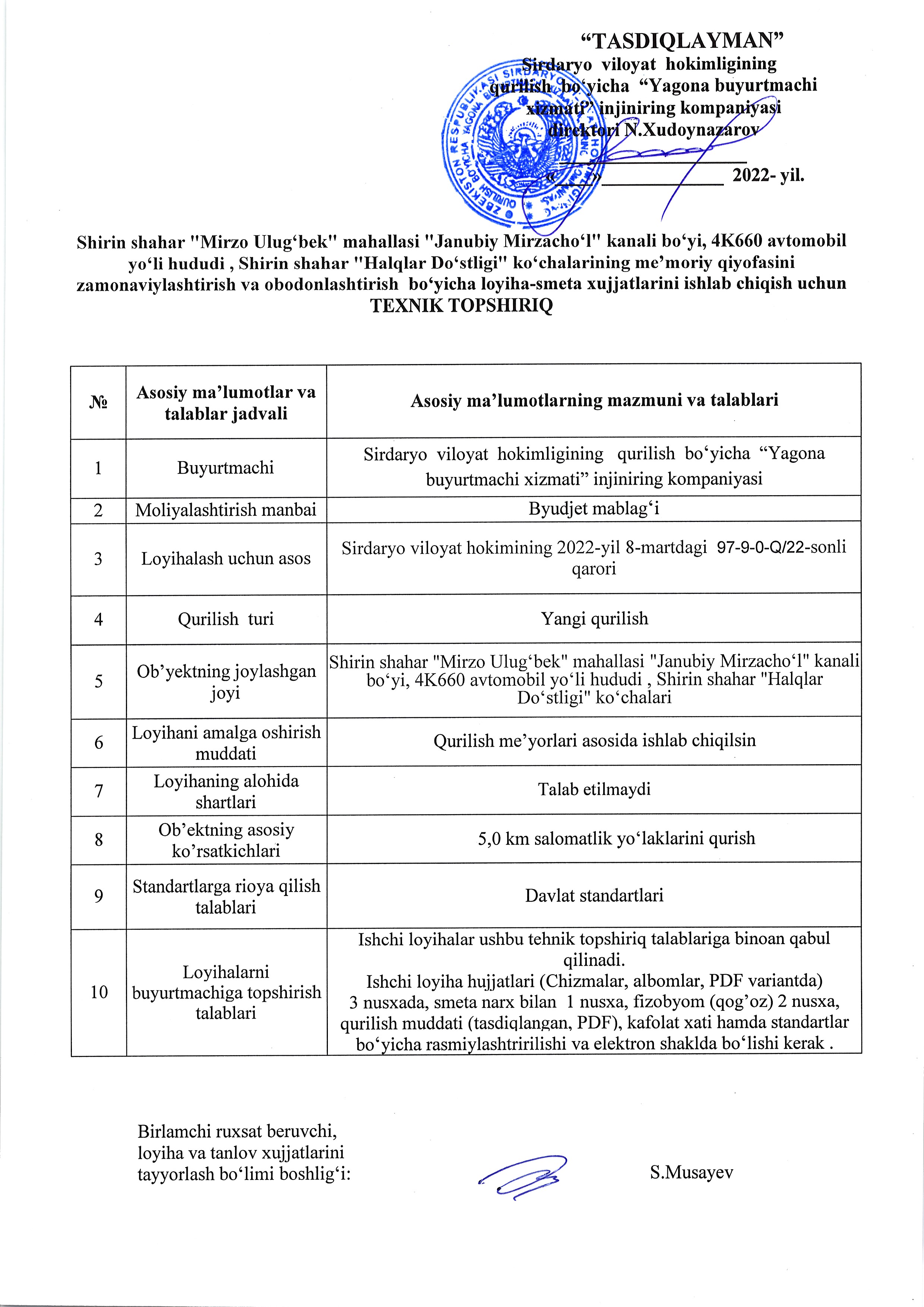 Shirin shaxar "Mirzo Ulug'bek" maxallasi "Janubiy Mirzacho'l" kanali bo'yi, 4K660 avtomobil yo'li xududi , SHirin shahar "Halqlar Do'stligi" ko'chalarining me'moriy qiyofasini zamonaviylashtirish va obodonlashtirish uchun loyiha smeta hujjatlari ishlab chiqish