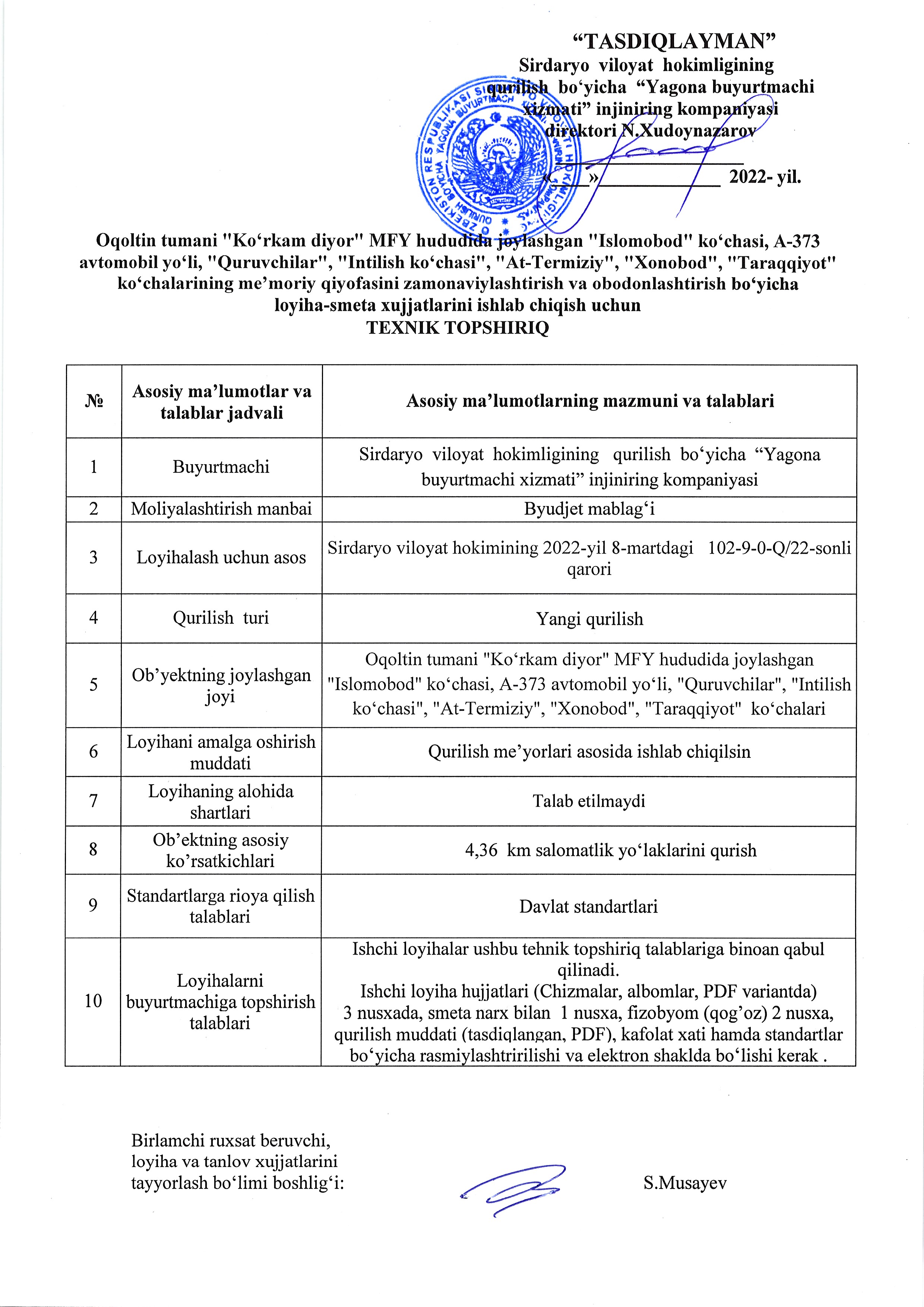 Оқолтин тумани "Кўркам диёр" МФЙ ҳудудида жойлашган "Исломобод" кўчаси, А-373 автомобил йўли, "Қурувчилар", "Интилиш кўчаси", "Ат-Термизий", "Хонобод", "Тараққиёт" "Шох" кўчаларининг меъморий қиёфасини замонавийлаштириш ва ободонлаштириш бўйича лойиҳа-смета ҳужжатларини ишлаб чиқиш